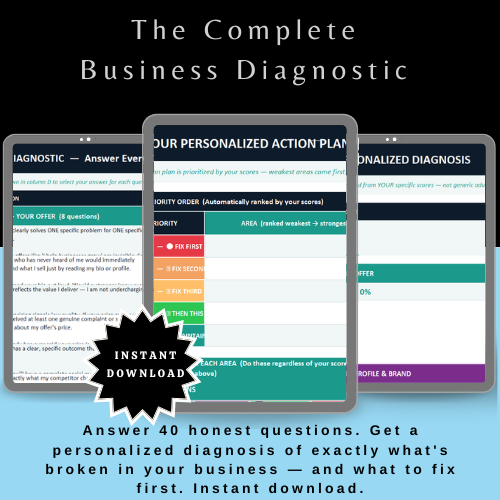 The Business Diagnostic changes that. Instead of guessing, you answer 40 honest questions about YOUR specific business. The tool scores your answers across 5 critical areas, identifies exactly where the breakdown is happening, and gives you a personalized action plan built around your real results — not someone else's.